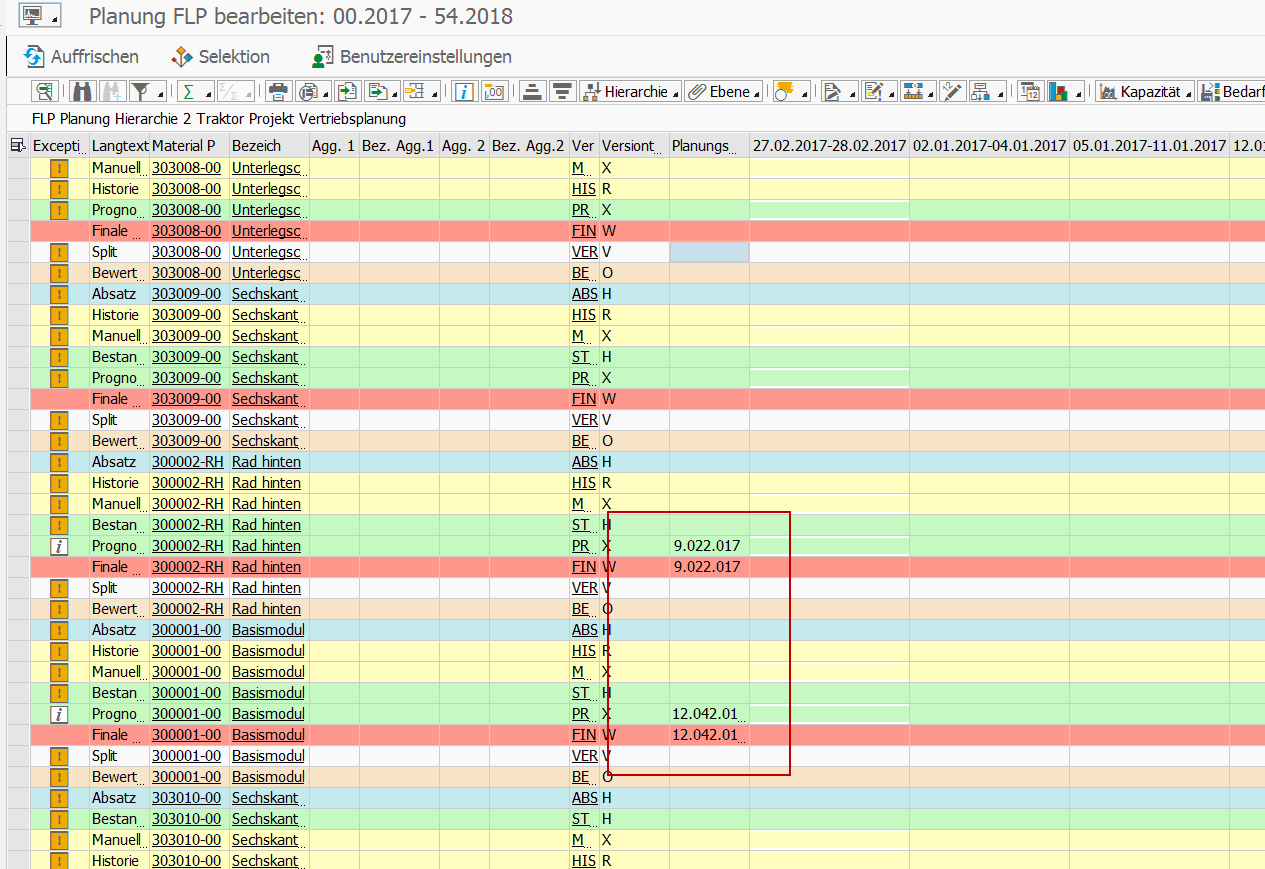 Wenn man im Planungssheet nach einer Spalte sortiert, werden die Versionen der Materialien durcheinandergeworfen. Hier sollte eine Möglichkeit geschaffen werden, die Materialien nach einer Kennzahl zu sortieren und die Versionen dabei zusammenzuhalten.