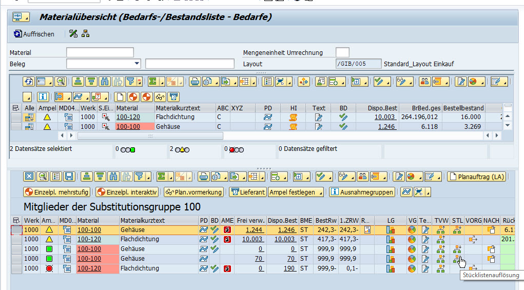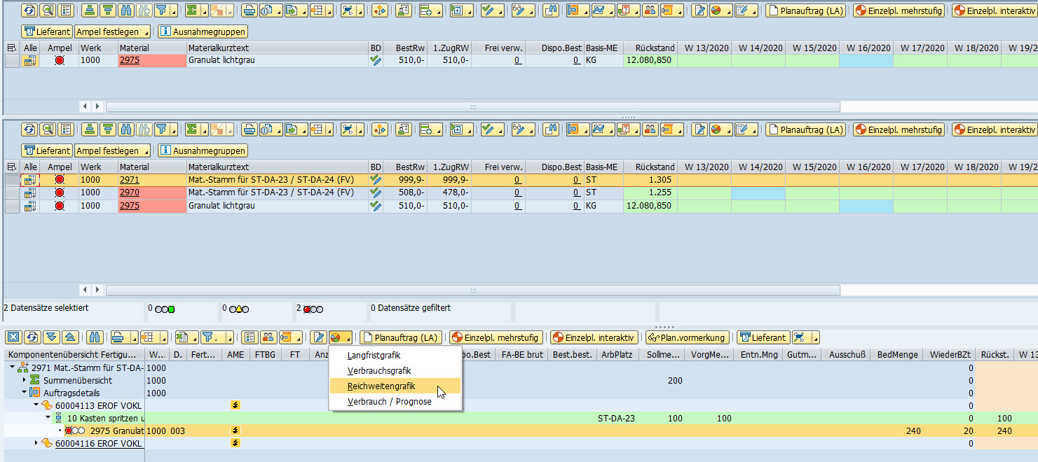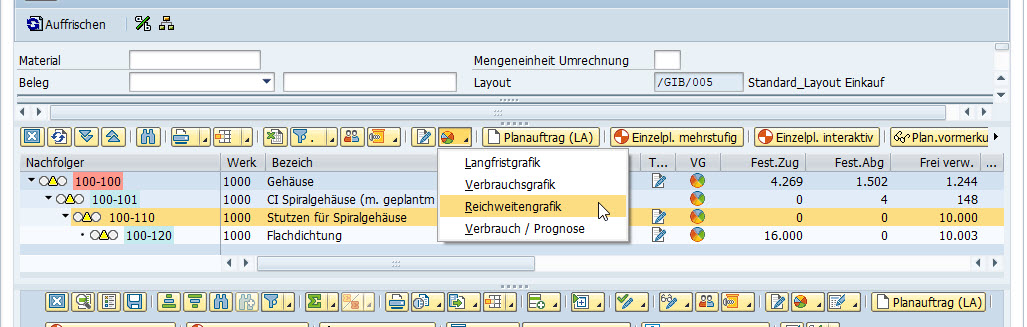 Für Substitutionsgruppen und Vorgänger/Nachfolger war der Test erfolgreich. Für die Detailfenster Stücklistenauflösung und Teileverwendung funktioniert es jedoch noch nicht. Hier wird zwar bei vorhandenem Reichweitenprofil die Ikone für die Grafik angezeigt, jedoch ist diese Ikone dann ohne Funktion. Beispiele auf FQ0: Werk:1010 Matnr: GB-FG-A0-F100 und GB-RM-S999-05