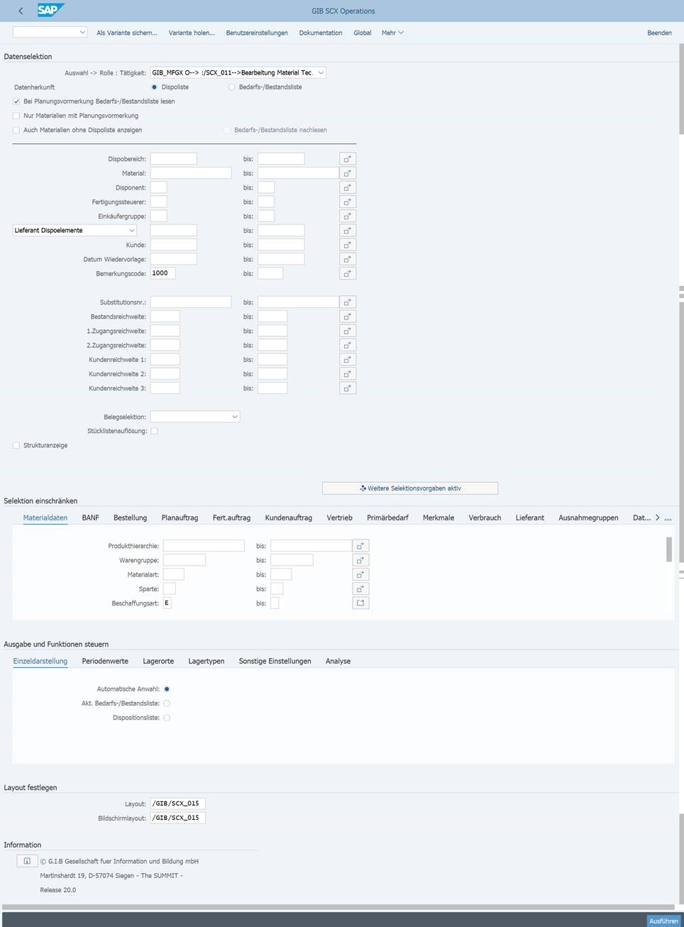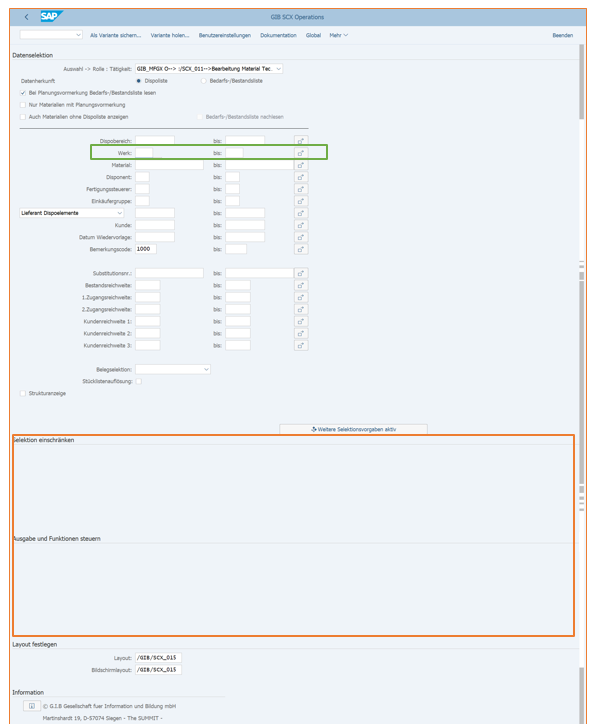 Der Rolle MFGX_O fehlte das Textfeld zum Selektionsfeld "Werk" unter der FUNCID '1904'. Funktion hinzugefügt. Nun wird das Selektionsfeld "Werk" auch angezeigt.