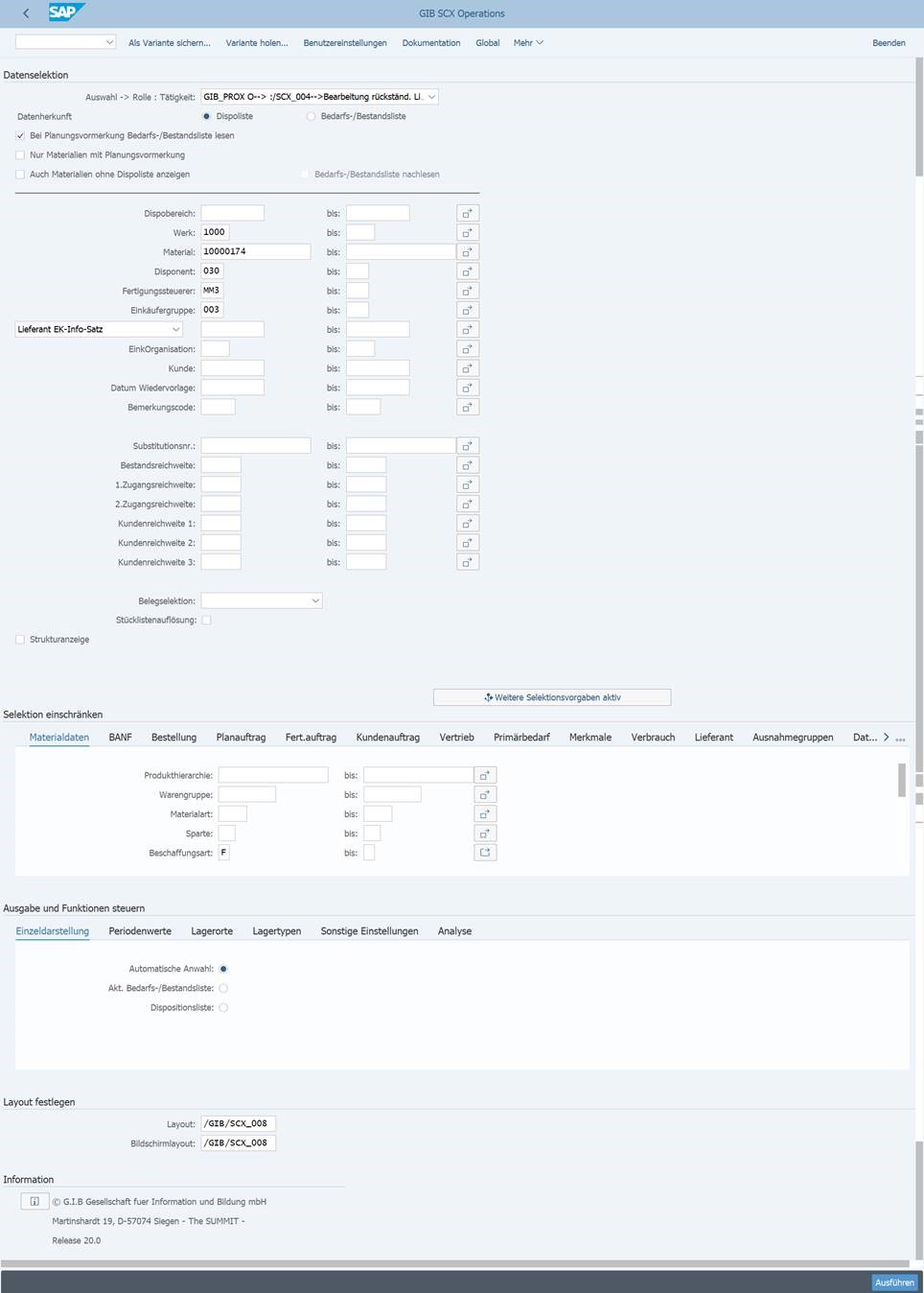 Beim Testen der Absprünge in der FQ0 ist uns aufgefallen, dass bei dem Absprung "Rückständige Lieferpläne" MFGX O alle Vorgabewerte welche wir über die TA /GIB/SCX mitgeben, übernommen werden, bis auf die Controllinggruppe. Im Anhang sind Screenshots die den Sachverhalt genauer darstellen.