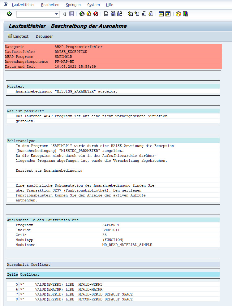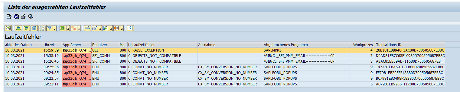 Aufruf in Q74 verursacht D UMP. AUfruf nur mir Werk 1000 ausgeführt. Sie Dump-Protokoll vom 10.3.2021 in der ST22