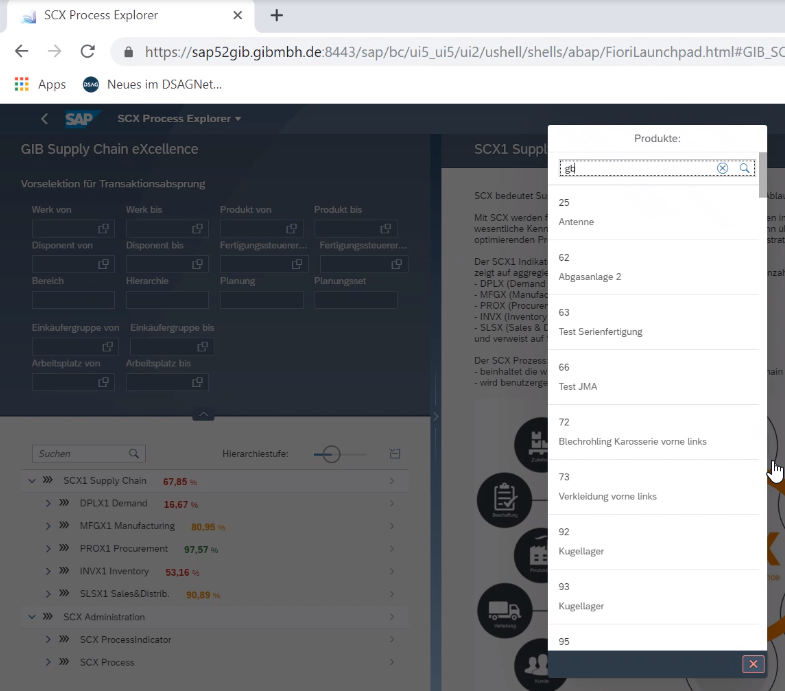 Created attachment 4506 [details] Suche FD0 Die folgenden Themen sind bei der Einrichtung auf dem Demosystem FD0 aufgefallen - Suchhilfe Material funktioniert nicht, die Suche liefert kein Ergebnis, es werden nur die ersten Materialien angezeigt - Ist eine Suchhilfe hinterlegt kann kein Wert manuell eingegeben werden, z.B. GB* es öffnet sich immer die Suchhilfe - übernommene Werte können nicht wieder gelöscht werden (FD0) - Die Suchhilfe Material heisst im Gegensatz zum allgemeinen Sprachgebrauch PRODUKT - auf der FD0 funktioniert die Materialsuche und die Werte können auch gelöscht werden (Chrome) - die Suchkriterien lassen sich nicht speichern, es muss jedes Feld bei jedem Einstieg neu eingegeben werden - Umlaute werden fehlerhaft dargestellt: Vorselektion für Transaktionsabsprung FE0: https://sap48gib.gibmbh.de:8443/sap/bc/ui5_ui5/ui2/ushell/shells/abap/Fiorilaunchpad.html?sap-client=200&sap-language=DE#GIB_SCX_RAC-display&/Function/%252F0/0/SCX1%2520Supply%2520Chain