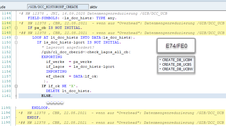 Hier kommen zwei Methodenaufrufe zum Einsatz, wo abgefragt wird, ob ein bestimmter Lagerort bzw. ein Sonderbestand überhaupt in irgendeinem Controlling-Bereich angefordert wurde. Programm: /GIB/DCC_HISTORY_KF Include: /GIB/DCC_HISTORYKF_CREATE Form-Routine: CREATE_DB_UCBS Form-Routine: CREATE_DB_UCBW Form-Routine: CREATE_DB_UCBM