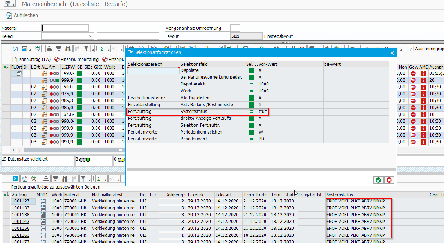 Wenn bei der Selektion der Fertigungsaufträge bspw. nur der Kopfstatus "TRÜC" für Teilrückmeldung eingeschränkt wird, so kann es hierbei zu einem Programmabbruch kommen.