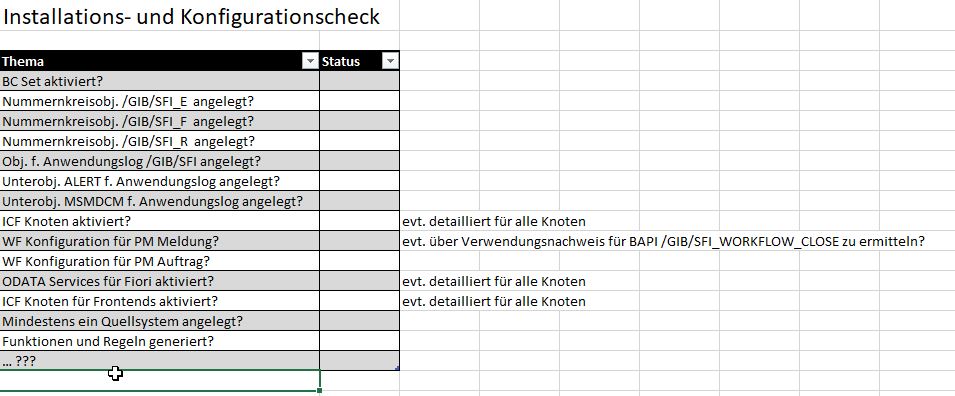 Nach Rücksprache mit Matthias Marx sind auch folgende weitere Punkte für den Check relevant: - SFI_COMM User angelegt (und berechtigt)? - Lizenzkeys eingetragen? - Key für Datenpunkte eingetragen? - Sind die SM59 Verbindungen verschlüsselt? - SSL Zertifikat vorhanden? (prüfbar??)