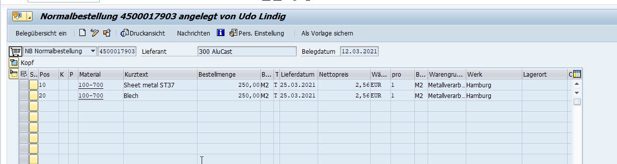 Created attachment 4805 [details] Ergebnis Restmenge umgesetzt Problem auf der Q74 nachvollziehbar Material 100-700. Werk 1000. Erstellen von mehreren Banfen. Banf auswählen und umsetzen. Bezugsquelle 300 dabei auswählen. Nach Erstellung der Bestellung diese ändern und die Menge reduzieren. Danach Refresh im Detailfenster und die Restmenge über Sammelbestellung mit neuer Position anlegen (User Einstellung). Neue Position ist jetzt in deutscher Sprache vorhanden, sieh Anhang.