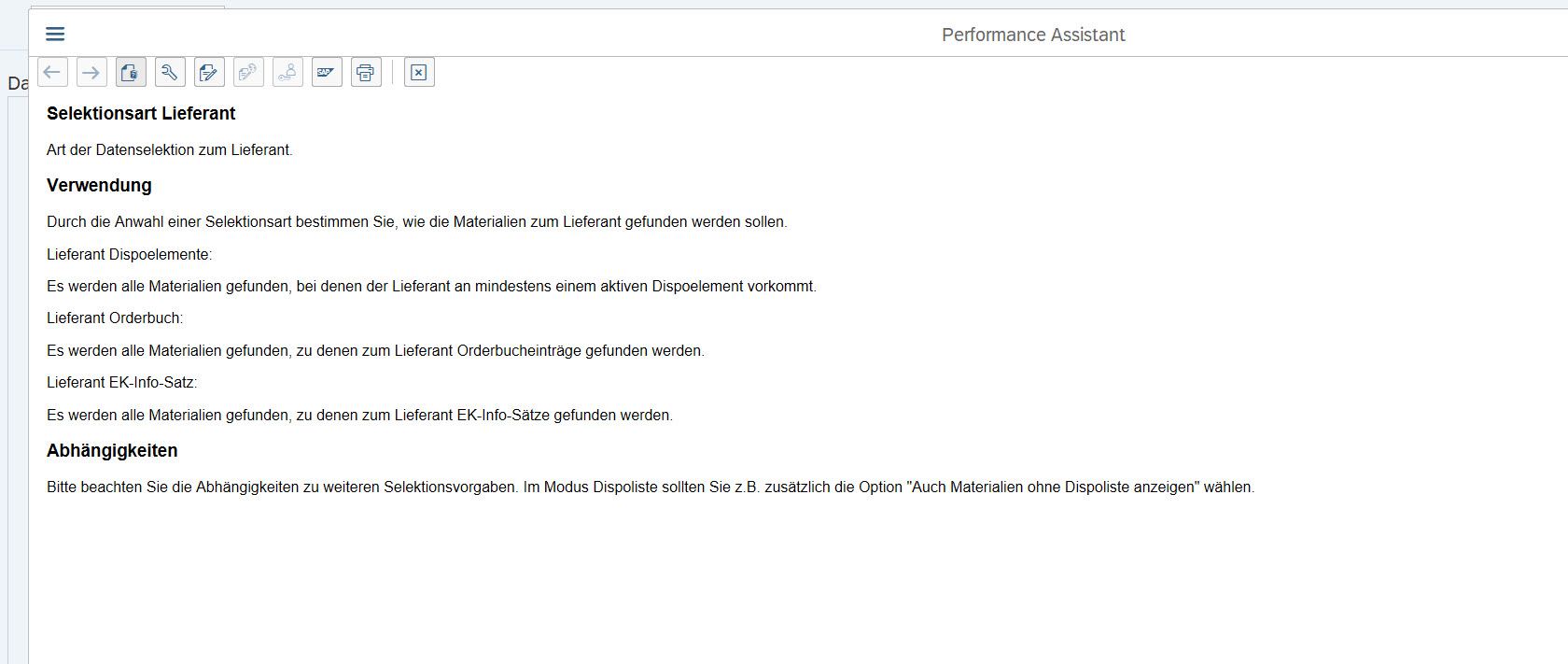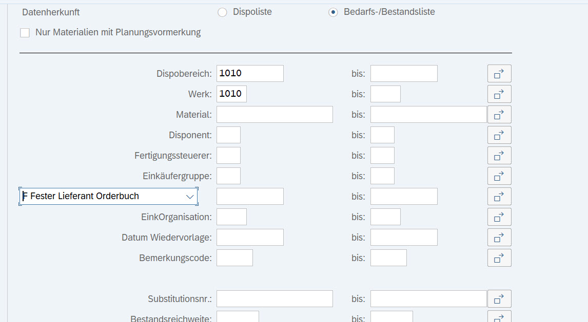 Created attachment 4994 [details] Selektionsbeispiel Fester Lieferant Orderbuch Die Selekion nach Lieferant funktioniert nicht wie andere Selektionsoptionen. Besonderheit ist hier, dass die Lieferantenherkunft vorangestellt ist und die Lieferatenherkunft. Trotzdem sollte die Funktion auch ohne Eingabe einer Lieferantennummer möglich sein. ( Aktuell funktioniert es mit * ) Hier sollten es auch ohne Stern funktionieren. Deshalb mein Vorschlag: Neuer Eintrag in der Auswahlbox, beide Modus ( DL und BBL ). " Ohne Auswahl oder Nicht eingeschränkt .. ". Ist dies ausgewählt, ist die Lieferantennummer nicht eingabebereit. Je nach Auswahl erfolgt dann die Einschränkung. So werden ohne Einschränkung eines Lieferanten bei Fester Lieferant Oderbuch alle Materialien ermittelt, zu denen ein Orderbucheintrag existiert, wo das fester Lieferant ausgewählt wurde. So funktioniert die Anwendung mit * Eingabe. Siehe DCO_LIEF_SEL.jpg Die F1 Hilfe muss angepasst werden, hier fehlen noch die Erklärungen zu Fester Lieferant ... und der Hinweis, dass Lieferant Dispoliste nur im Modus DL zur Verfügung steht.