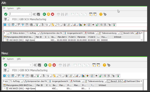 Die Globale Toolbar wird in einem Splitter-Container dargestellt. Sowohl der Splitter-Trenner, als auch die Möglichkeit, diesen zu verschieben ist unnötig. Ohne den Splitter-Trenner wirkt die Toolbar integrierter und durch die komprimiertere Darstellung kann eine weitere ALV-Zeile auf dem Bildschirm angezeigt werden.
