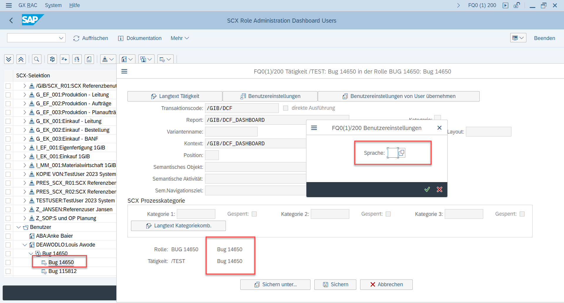 Erfolgreich überprüft auf der FQ0. Es werden in der Tätigkeit nur noch die aktiven Benutzereinstellungen angezeigt. In der Tätigkeit BUG 14650 demensprechend nur noch die Benutzereinstellungen Sprache. Siehe Screenshot.