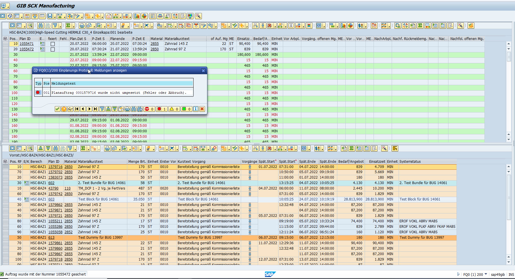 Fehlerhafte Statusmeldung beim umsetzen (Ohne FV) oder abbrechen beim anlegen von Planaufträgen