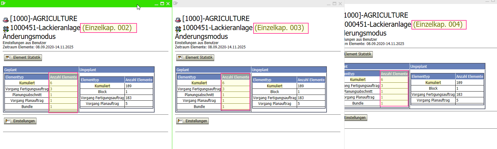 In der Bereichsinfo wird eine Statistik ermittelt mit geplanten und ungeplanten Elementen. Bei den geplanten Elementen wird nicht nach Einzelkapazitäten gefiltert, es werden immer alle Elemente für diesen Bereich angezeigt.