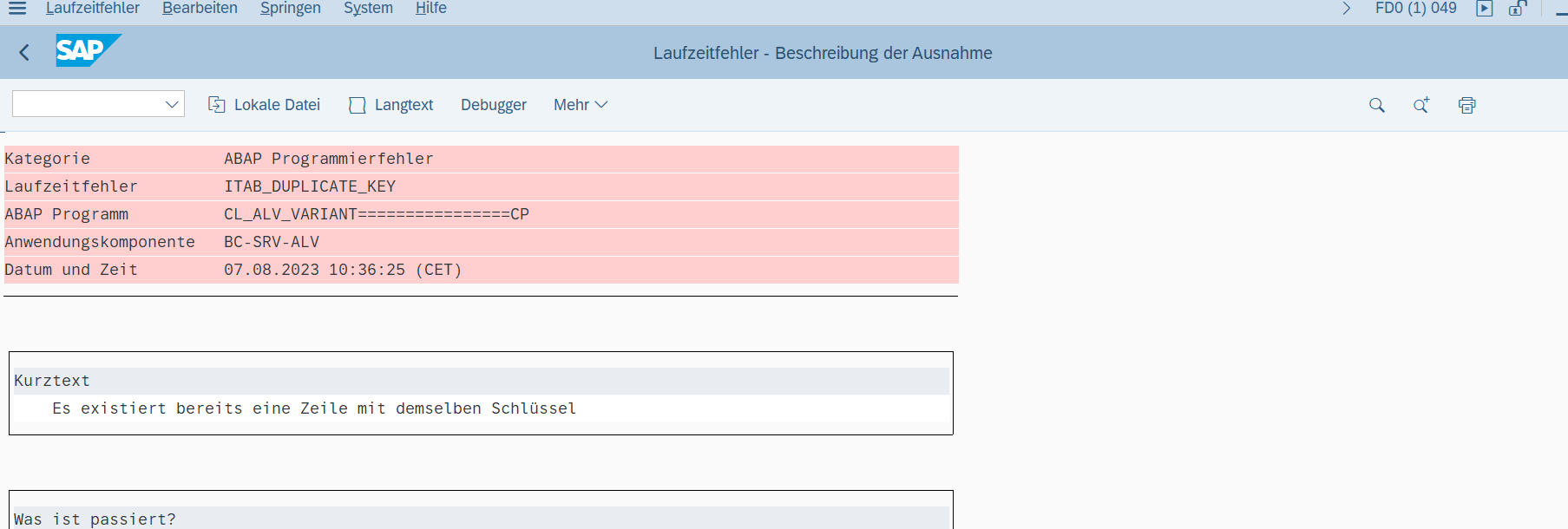 Es werden in dem Feldkatalog 2 mal die gleichen Felder aufgenommen. Beim Insert in den Feldkatalog wird geprüft, ob es den eintrag Bereits gibt. Programm: /GIB/DCO_CHARGEN Form: std_init_fieldcat Erledigt auf FE0,E74