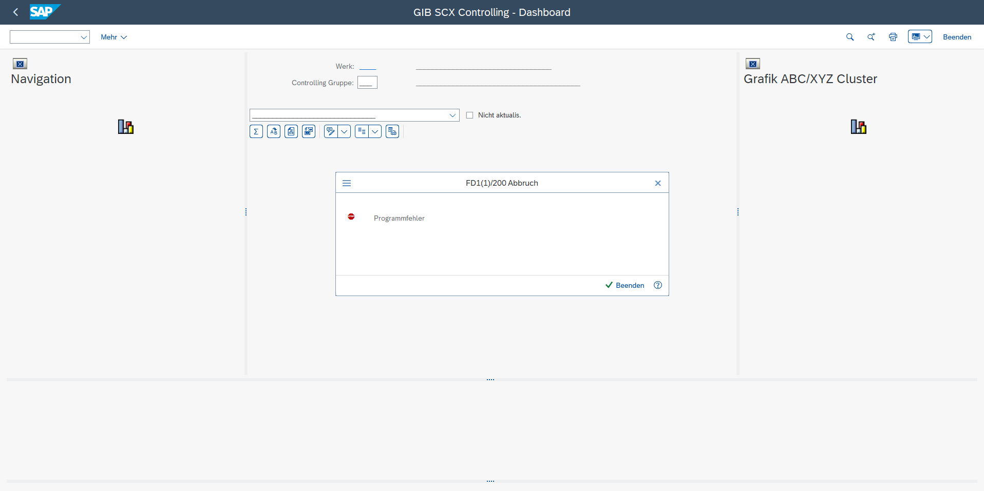 Schaltet man die Grafiken "Keine Periodendarst." und "Keine Matrixgrafik" in den Benutzereinstellungen aus, kann das Dashboard wieder aufgerufen werden. Möchte man sich bspw. in der Potentialanalyse die Langfristgarfik per Toolbar Button öffnen, kommt es ebenfalls zum "Programmabbruch" ------ Programmfehler Meldungsnr. 0K534 Diagnose Eine häufige Ursache ist, daß die Ausgabetabelle, die dem ALV übergeben wird, nicht global sondern lokal definiert worden ist und somit die Referenz auf die Tabelle verloren geht. Dies hat zur Folge, daß der ALV keine Ausgabetabelle mehr zur Verfügung hat. Vorgehen Definieren Sie die Ausgabetabelle global. ----- Das Aufrufen der ABC Analyse führt ebenfalls zu einem Programmabbruch (/GIB/DCC_ABC)