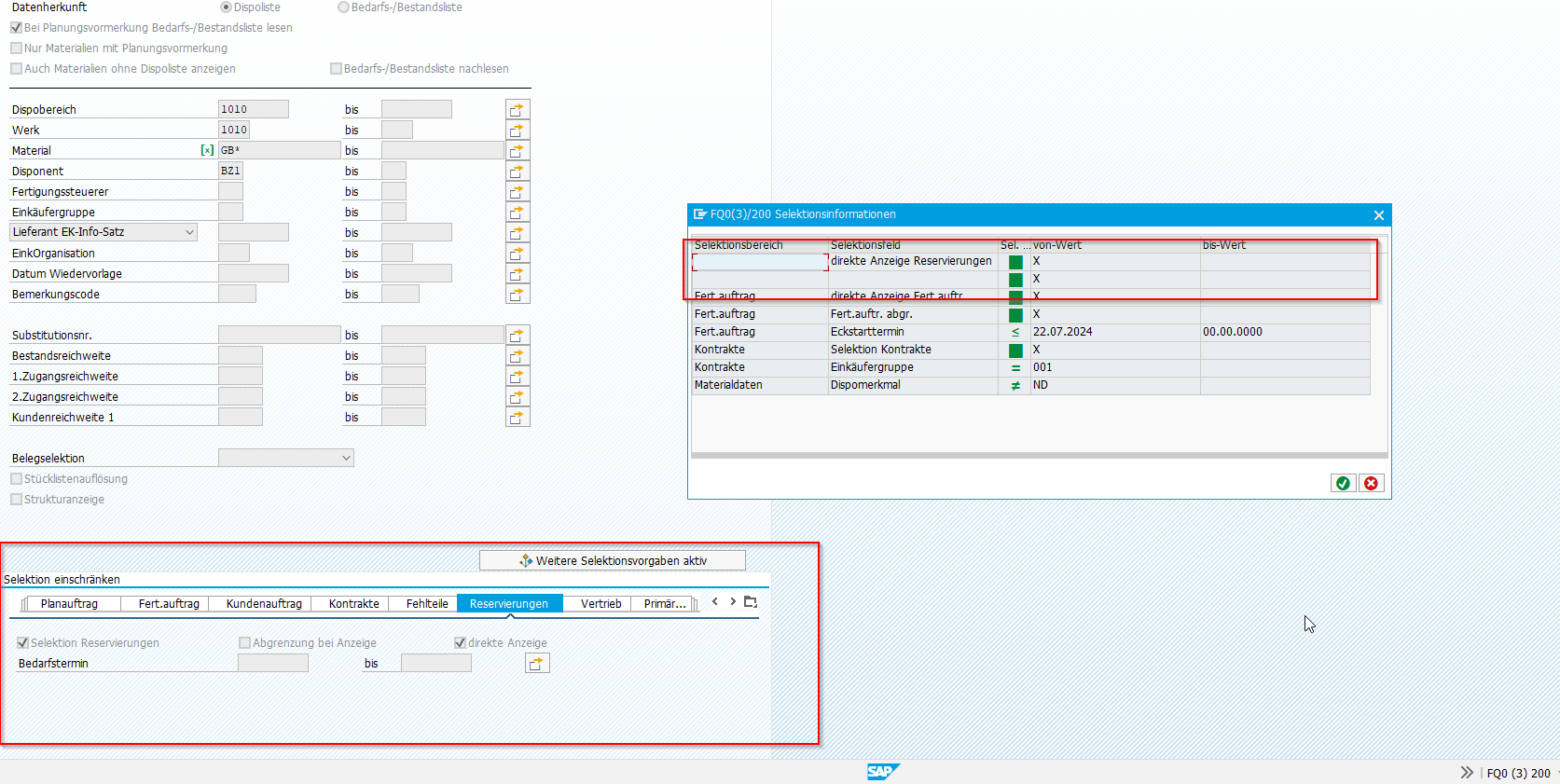 Die Zeile des Buttons "Weitere Selektionsvorgaben aktiv" soll immer vorhanden sein, damit der Bildschirm sich nicht verschiebt, sobald eine erste Selektionsvorgabe aktiv ist. Zudem fehlen noch bei Klick auf den Button einige Bereiche (z.B. im Reiter Kontrakte). Diese sollen ergänzt werden.