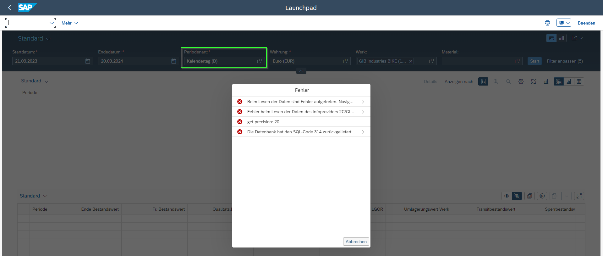 Created attachment 6731 [details] Absprung periodische Bestandsanalyse aus Dashboard Periodizität "Leer" Stichtag (D) wird jetzt übergeben aus den Benutzereinstellungen (PERPO). siehe Screenshot Beim Aufrufen der App "Periodische Bestandsanalyse" kommt es zu verschiedenen Fehlern. Soll hierzu ggf. ein separater Bug eröffnet werden? 1) Beim Lesen der Daten sind Fehler aufgetreten. Navigation ist möglich 2) Fehler beim Lesen der Daten des Infoproviders 2C/GIB/I_DCC_STOCK_PER_CUBE 3) get precision: 20. 4) Die Datenbank hat den SQL-Code 314 zurückgeliefert. Der Fehlertext lautet: numeric overflow: the precision of the decimal value is ...