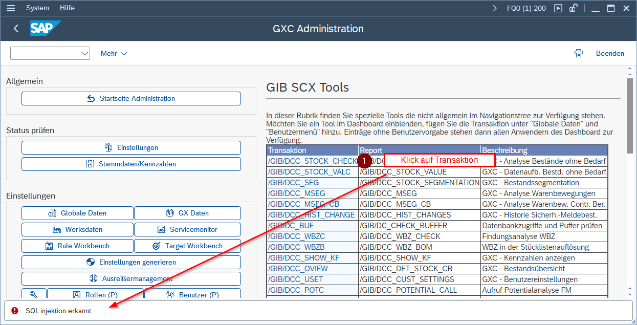 Beim Aufruf der Transaktionen in den Tools kommt es zu dem Fehler "SQL injektion erkannt". Meldungsnr. /GIB/DCC709