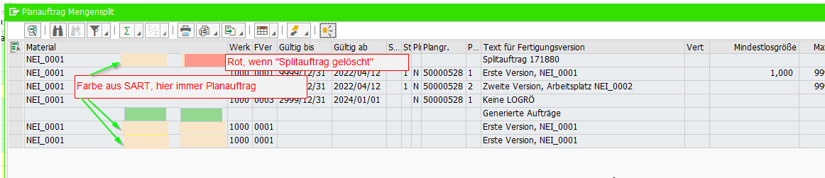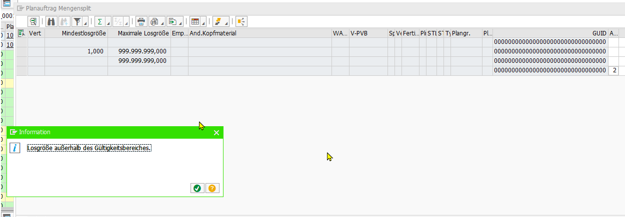 Das Dialogfenster Planauftragssplit soll zwecks Anwenderfreundlichkeit überarbeitet werden: - Wenn bei einer Fertigungsversion keine Losgröße hinterlegt ist, dann ist der Mengensplit nicht möglich, hier kommt dann die Fehlermeldung "Losgröße liegt außerhalb des Gültigkeitsbereichs". Wenn keine Losgröße in der FV hinterlegt ist, muss jede Losgröße möglich sein - F1 Hilfe für das Feld "Feste Losgröße" fehlt (Feste Losgröße aktiviert addiert automatisch den Baugruppen-Ausschuss aus dem Matreialstamm (Dispo1) zur Gesamtmenge) - F1 Hilfe für das Feld Planlosgröße fehlt - Die Felder für den Eintrag des zu splittenden Planauftrags (erste Zeile) darf keine änderbaren Zellen haben, diese funktionieren auch gar nicht - Die Felder für die Einträge gesplitterter Planaufträge (neue Zeilen nach dem Splitt) darf keine änderbaren Zellen haben, diese funktionieren auch gar nicht - Die Zeilen sollten zur besseren Übersichtlichkeit farblich gekennzeichnet werden: ○ Überschrift / Splittauftrag: Farbe Planauftrag wie GXM, falls "gelöscht": rot [ALV 6/0/0] ○ Auswählbare Fertigungsversionen: Keine spezifische Einfärbung ○ Überschrift "Generierte Aufträge": grün [ALV 5/1/0] o Neu generierte Aufträge: Farbe Planauftrag wie GXM