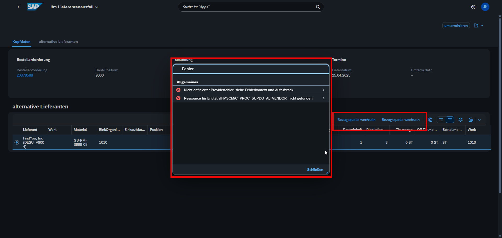 Die Funktion wurde nur für Bestellanforderungen realisiert. Diese können über den neuen Button "Bezugsquelle wechseln" entsprechend direkt verändert werden. Aufgrund der Komplexität im Prozess des Wechsels des Lieferanten im Falle einer Bestellung, soll hier aktuell kein automatisierter Wechsel angeboten werden.