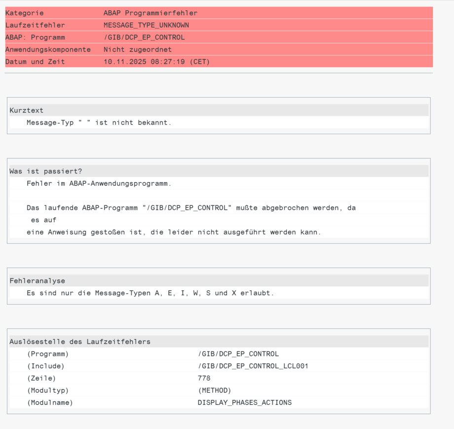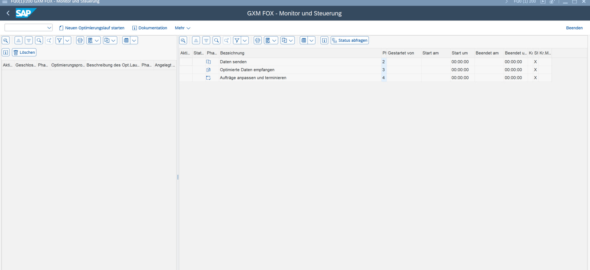 Wird ein oder werden mehrere Optimierungsläufe gelöscht, und es ist kein weiterer mehr zur Anzeige vorhanden kommt es zu einem Laufzeitfehler. Wird die Transaktion (/GIB/DCP_EP_CONTROL) danach wieder aufgerufen, so werden die Phasen 2-4 angezeigt, obwohl überhaupt kein Optimierungslauf vorhanden ist.