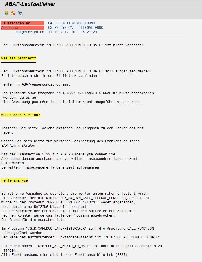 Created attachment 778 [details] Dump Langfristgrafik FUBA /gib/dco_langfristgrafik dumpt mit Laufzeitfehler CALL_FUNCTION_NOT_FOUND Ausnahme CX_SY_DYN_CALL_ILLEGAL_FUNC aufgetreten am 11.10.2012 um 16:21:20 Der Funktionsbaustein "/GIB/DCO_ADD_MONTH_TO_DATE" ist nicht vorhanden
