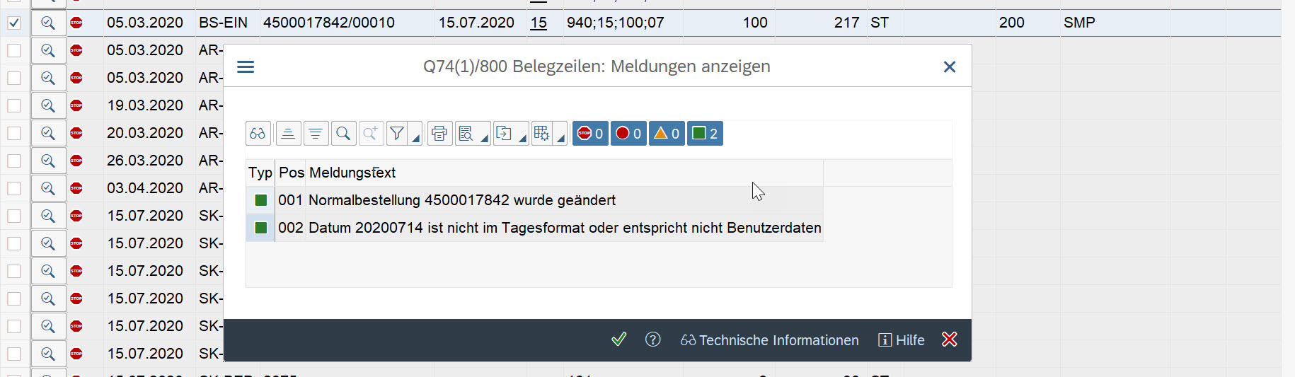 Created attachment 5380 [details] Beispiel Q74 Obwohl das Datum ein Tagestyp ist, erscheint das Meldungsfenster, eine Änderung der Bestellung erfolgt aber nicht. SYstem Q74, Werk 1000, Material 2884, Bestellung 4500017842 / 00010.