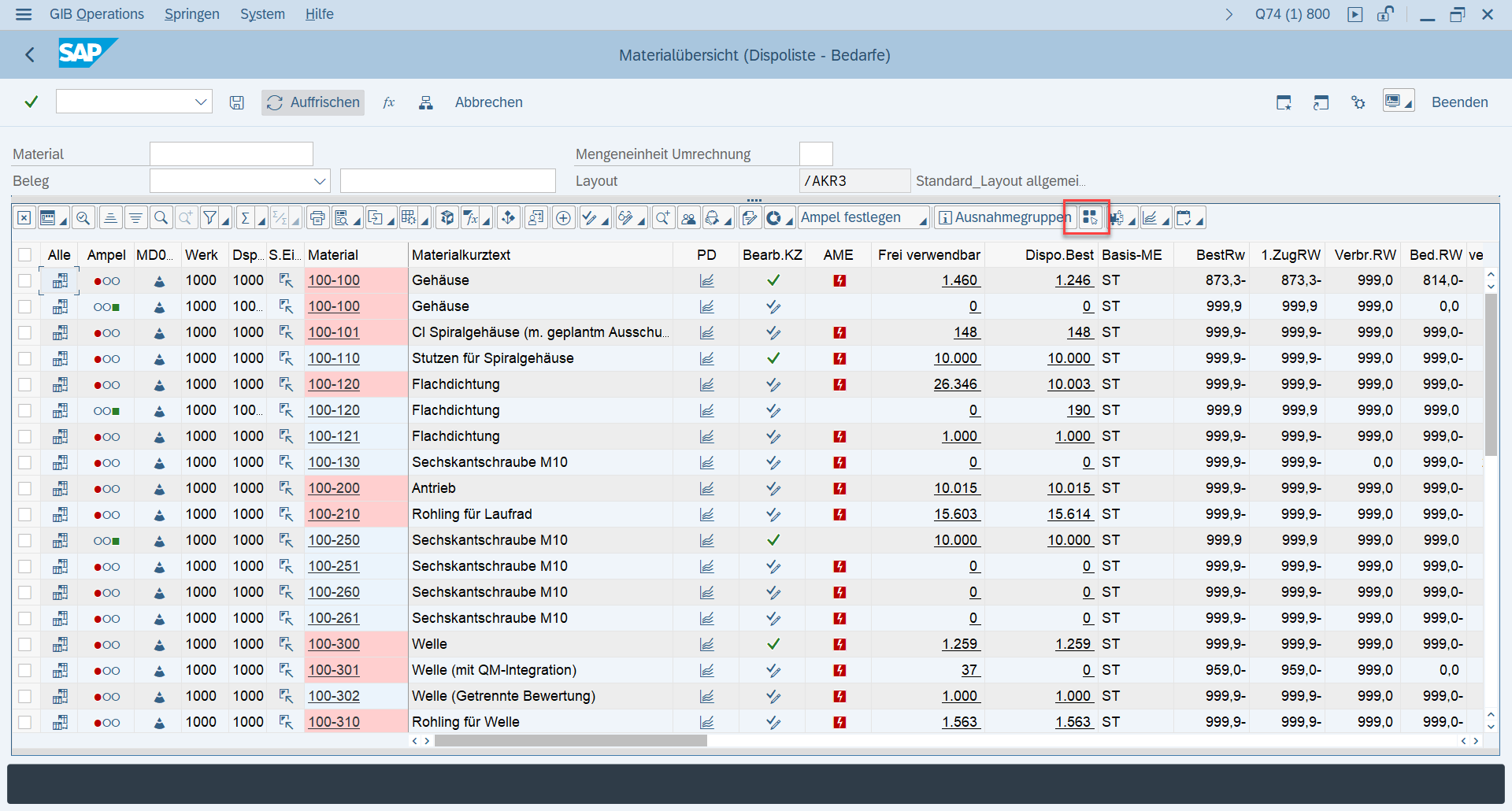 Im Function Manager habe ich einen Button angelegt, welcher in die MM03 springt. Die Funktion wurde einer Rolle im RAC zugewiesen und meinem Benutzer zugeordnet. Nach dem Absprung über das RAC in das DCO wird der Button in der Materialübersicht angezeigt. Somit ist der Test erfolgreich. Siehe Screenshot