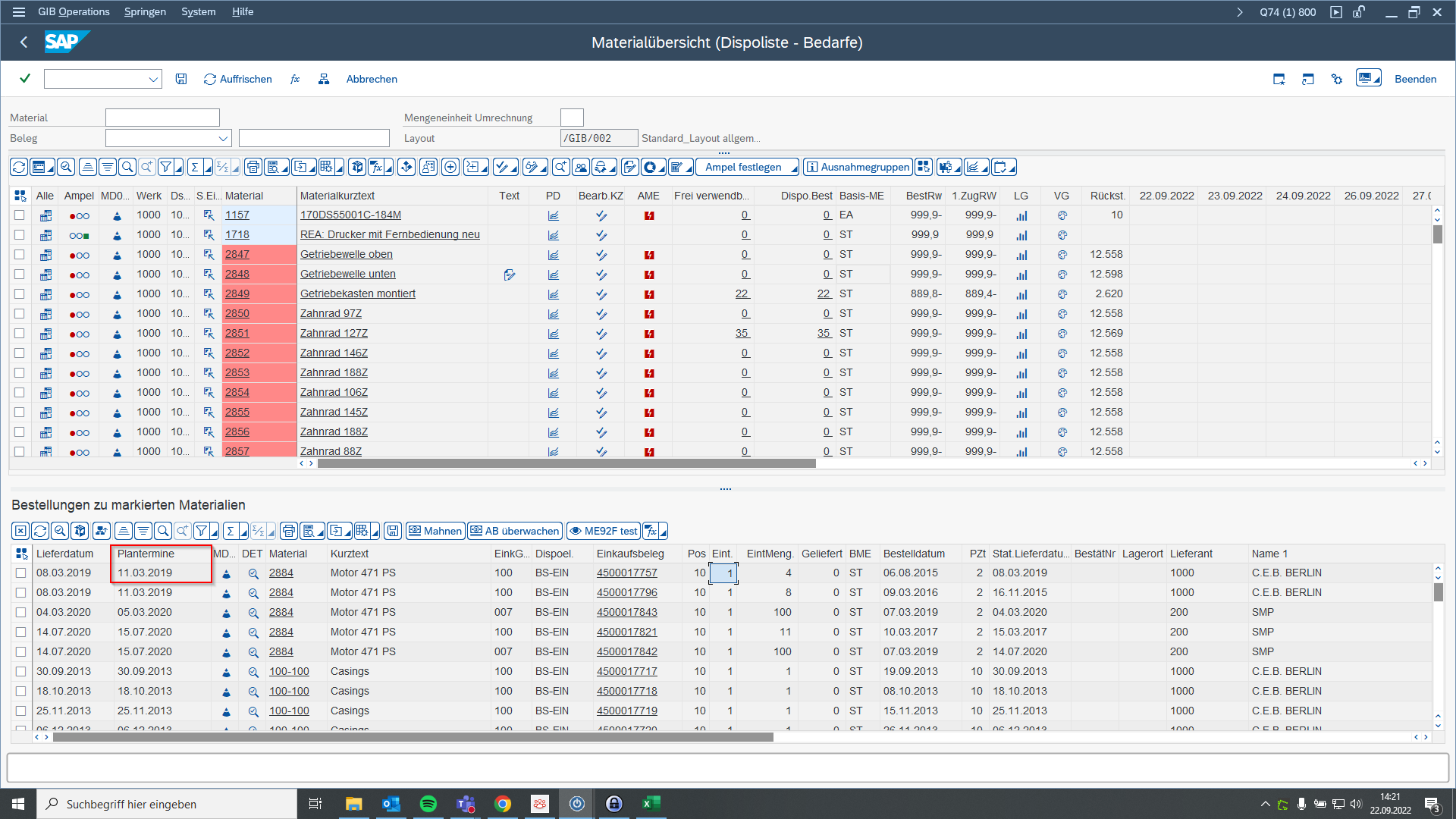 E74/ FE0 Funktionsgruppe /GIB/DCO_DISPOLISTE_BEST Form CUST_SELECTION_GET_DATA Struktur /GIB/DCO_BEST_SEL_S, /GIB/DCO_BEST_FK Neues Feld verfügbar in Detailfenster Bestellung: "Plantermine" Zeigt nun auch das Verfügbarkeitsdatum analog zu MD04